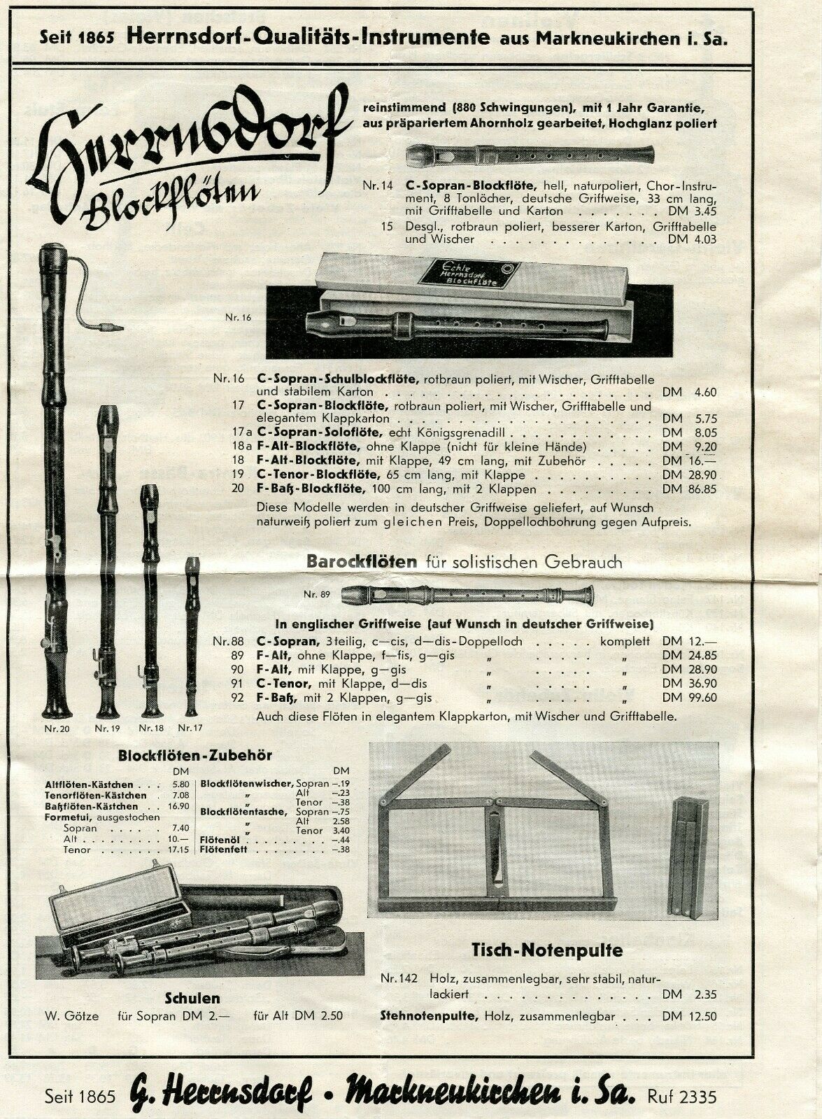 Die Firma Gustav Herrnsdorf wurde wahrscheinlich schon 1871 für Fabrikation und Handel von Musikinstrumenten gegründet. In der Weltwirtschaftskrise wurde dann der Name "Herrnsdorf" verkauft und es wurden Blockflöten hergestellt. In den 50er Jahren lief das dann auch schlechter, so verlegte man sich teilweise auf die Fertigung von Möbelbeinen. Später stellte man auch E-Gitarren her.