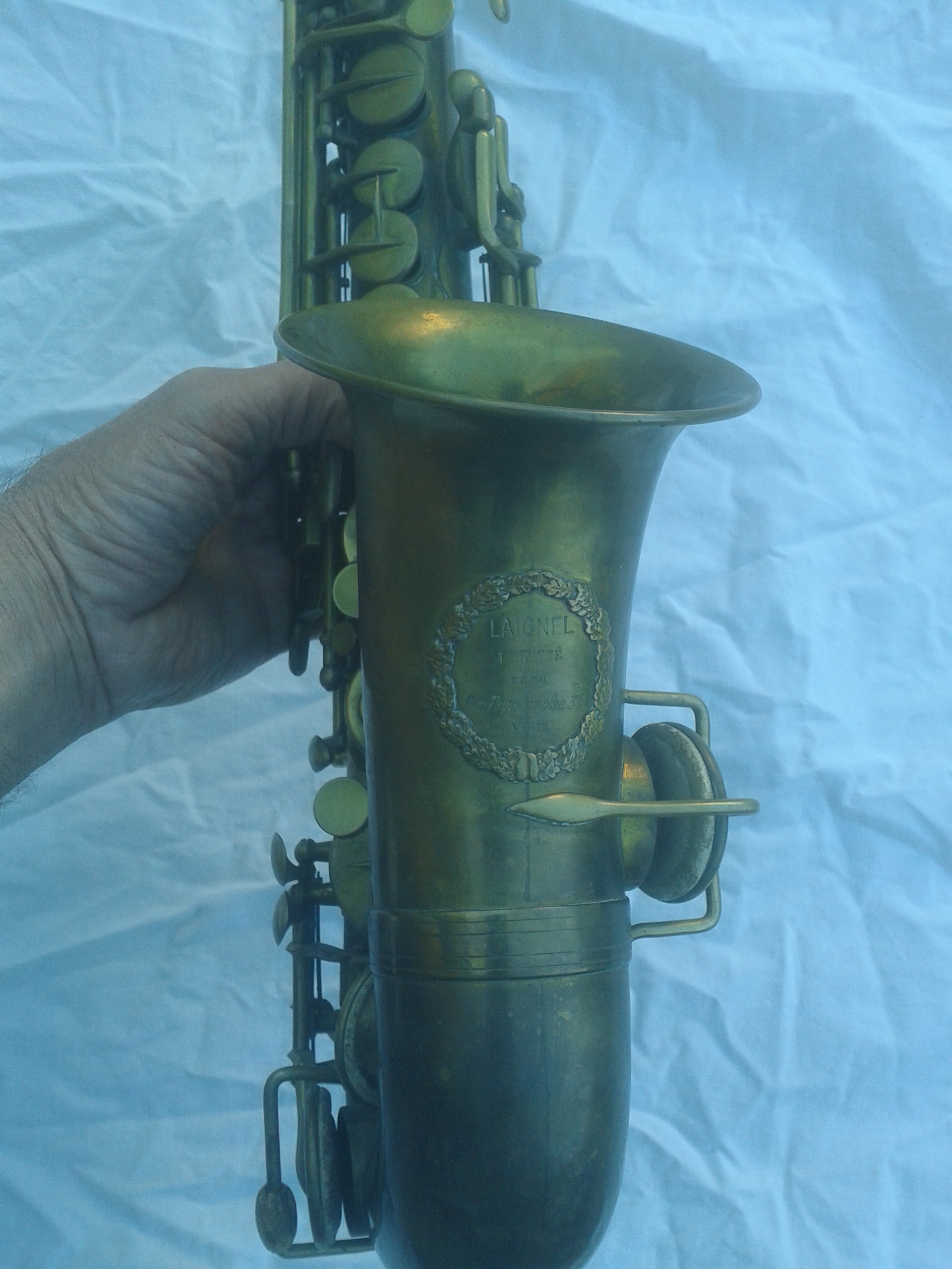 Nun zu meinem gesichteten Instrument. Es handelt sich um ein Alt Saxophon, wohl noch aus dem 19. Jahrhundert, welches ich als eine abgespeckte Version dieser Herfort Modelle sehe, da vom selben Hersteller, aber nicht mehr mit Gaubert gezeichnet. Lediglich Laignel, aber auch mit dem aufgelötetem Lorberkranz. Auch bei diesem Instrument ist die linke Kleinfingermechanik mit dem tiefen C verbunden, ferner weitere Verbindungen der rechten mit der linken Hand. Ich sehe das Instrument als Prototyp, da verschieden Veänderungen in der Fertigung sichtbar sind. Genaueres später einmal. Eventuell werde ich das Instrument in der Zukunft für den Eigentümer restaurieren, dann werde ich mehr erfahren.