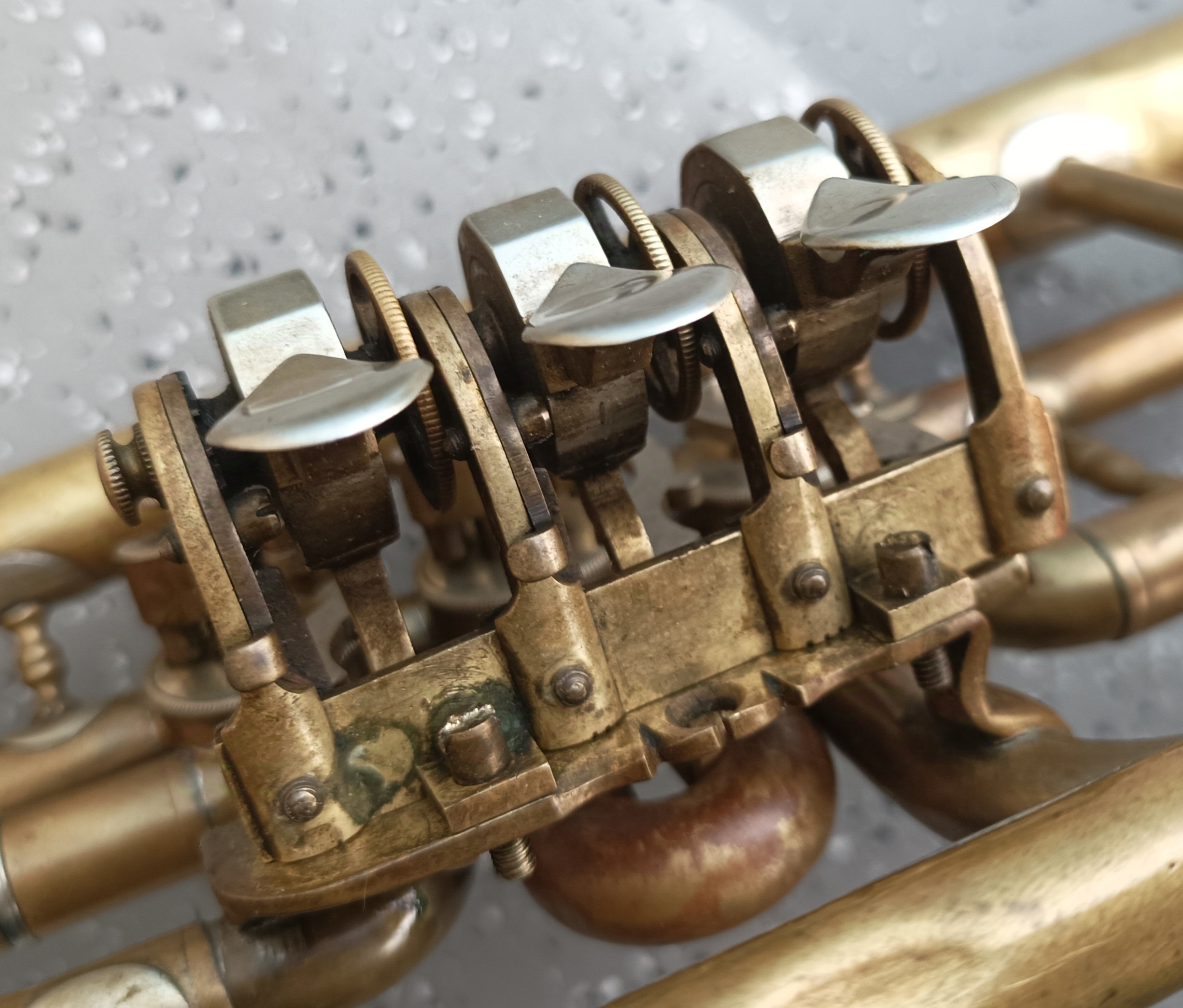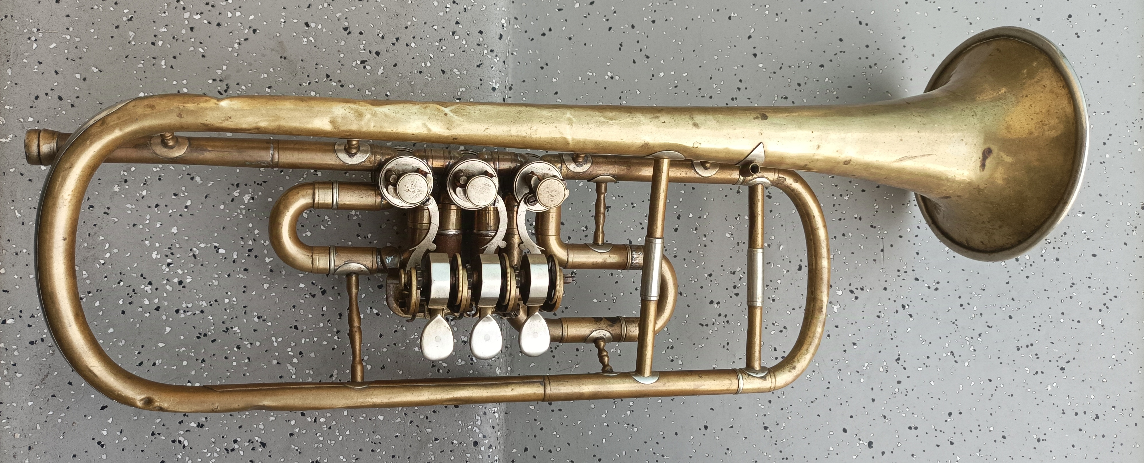 kann jemand einschätzen wie alt die abgebildete Bb Trompete ohne Herstellerangabe ist und aus welchem Land die vielleicht stammen könnte? Die Trompete ist relativ breit und die Mechanik sieht schon älter aus. Gewicht beträgt nur 826 g. Relativ kleiner Schallbecher mit ungewöhnlich dickem Rand (Draht).