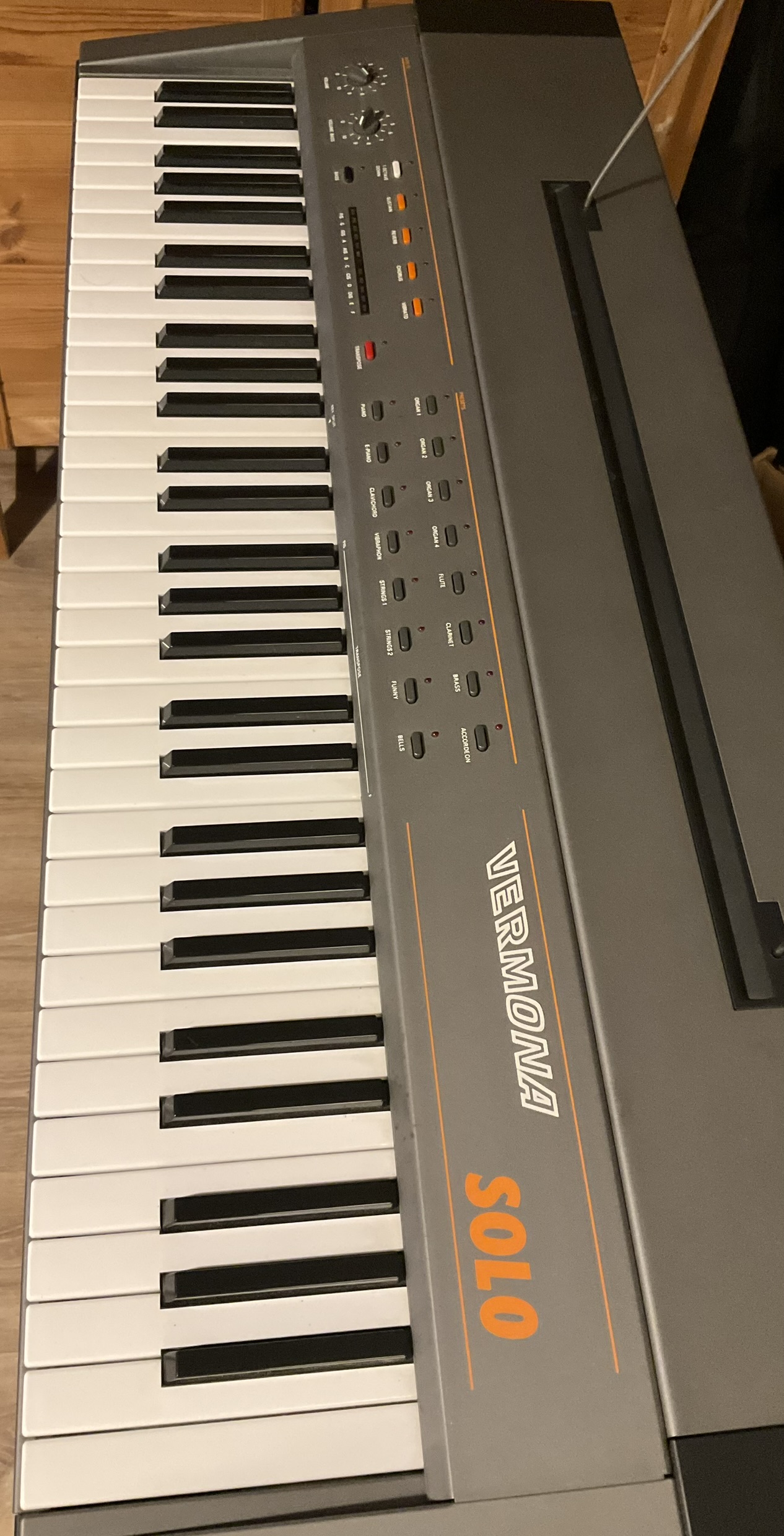 Das Keyboard heißt "VERMONA SOLO", so dessen Aufschrift. Auf dem Originalkarton steht allerdings "K-61", nicht zu verwechseln mit dem "SK-86", das ja verkauft wurde. Klanglich erinnert mein "SOLO" an das SK-86, auch die Sounds sind ähnlich, wenn nicht sogar kompatibel. Mein Gerät hat aber keine integrierten Lautsprecher und auch keine Rhythmus-Sektion. Bis vor unserem Umzug nach Thüringen hat das Gerät auch funktioniert. Leider ist vermutlich etwas durch die zwar trockene, im Winter aber dennoch kühle Lagerung(?) auf unserem Dachboden (um die 10°C) defekt gegangen? :(