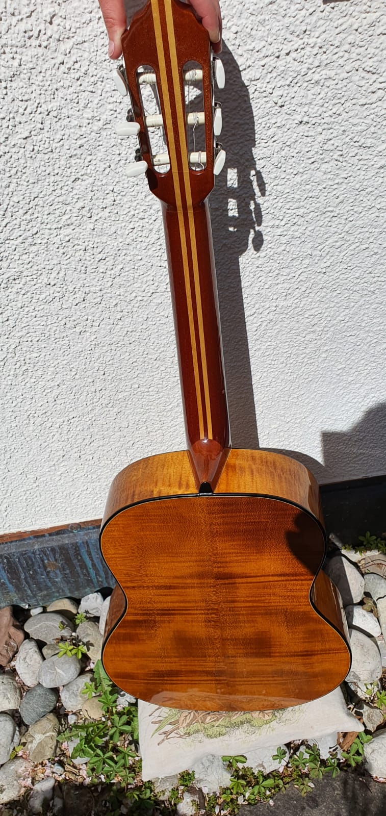 Es handelt sich bei ihr um eine außerordentlich schöne (wie ich finde) Konzertgitarre, welche kaum bespielt und sorgsam bewahrt wurde. Deshalb würde ich den Zustand Laienhaft ihrem Alter entsprechend als erstaunlich gut beschreiben.